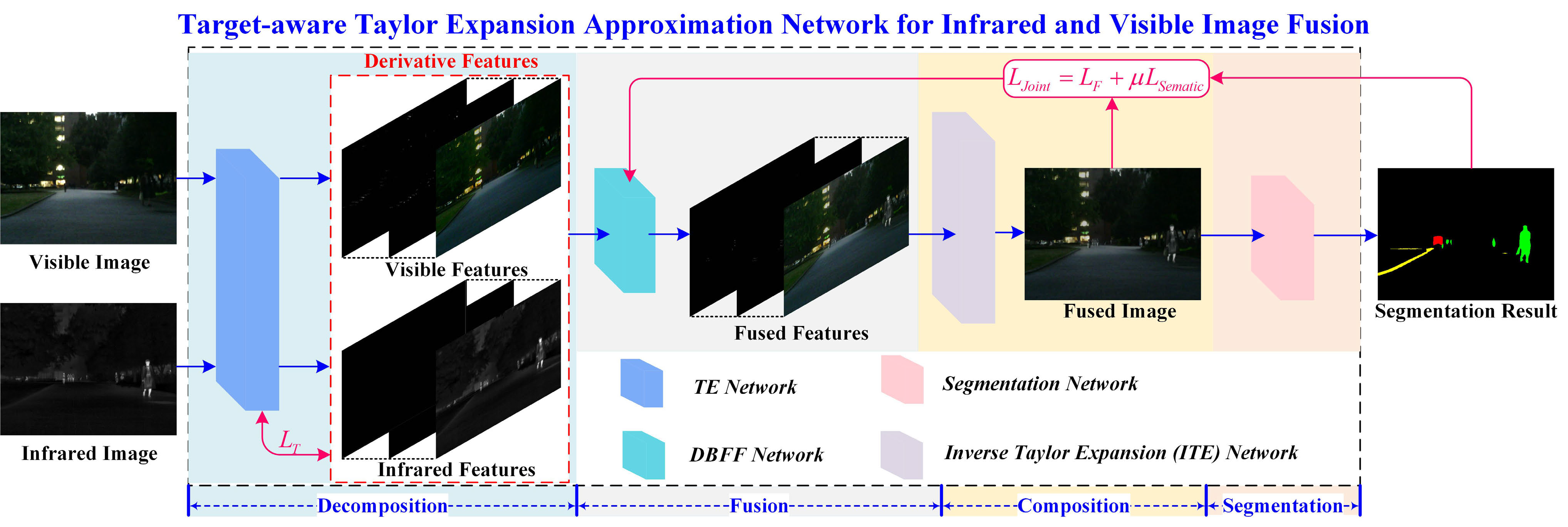 输入IR/VIS → 泰勒展开近似网络(TEA)分解 → 分阶双分支特征融合网络(DBFF网络)特征融合 → 逆泰勒展开(ITE)网络重构 →分割头联合优化(利用语义分割网络对融合图像进行细化)