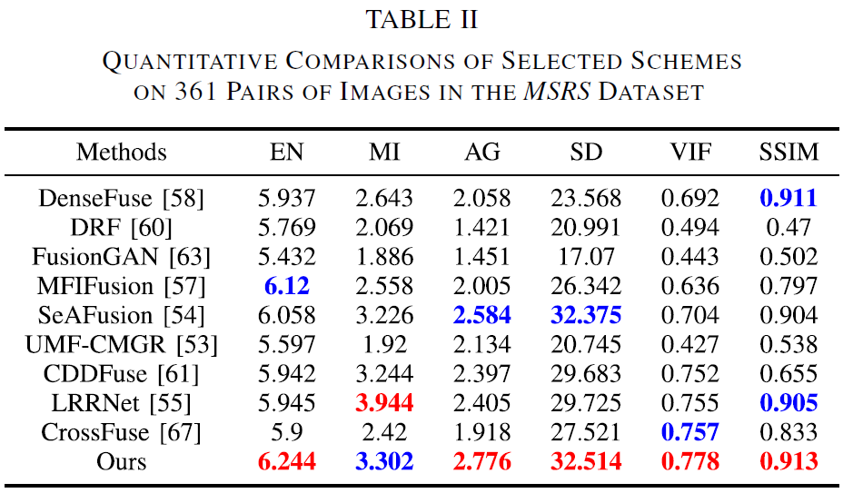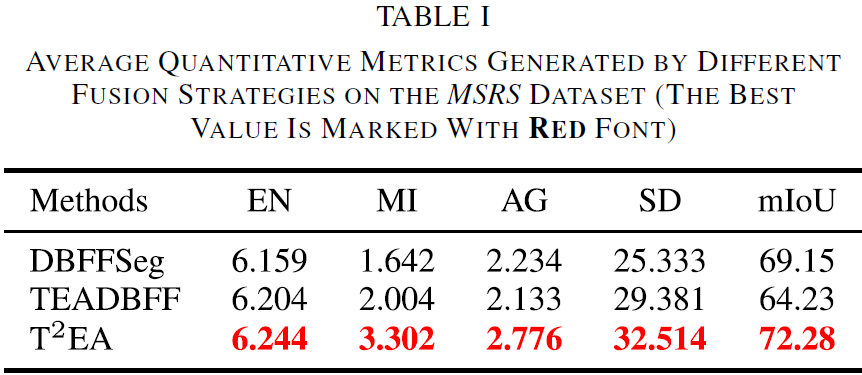 论文将 361 对 MSRS 图像上的客观指标汇总于 Table II,并指出:T2EA 在所有定量指标上取得最优值,进一步说明其在“保细节 + 突目标”上的综合能力更强。