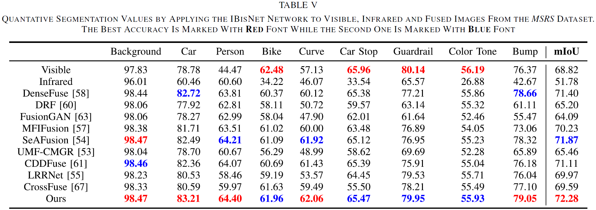 - 指标:Table V 统计了 9 个类别的 IoU 与 mIoU;论文结论是:相较其他融合结果,IBisNet 在 T2EA 融合图上取得各类别最优,且 mIoU 也最好,进一步说明 T2EA 更利于分割任务。