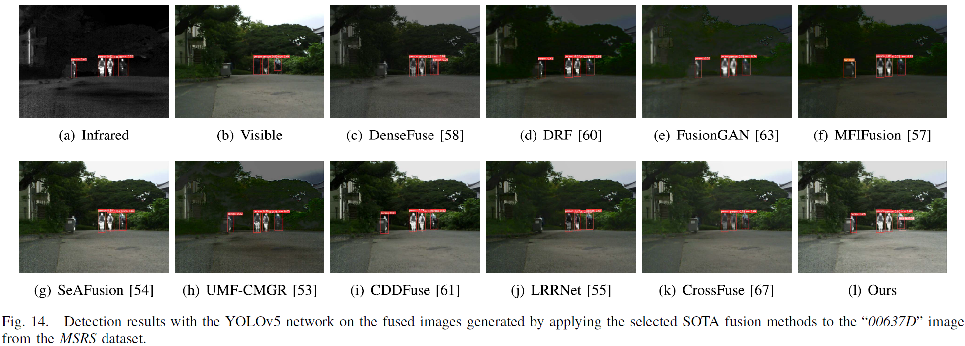- LRRNet / CrossFuse:更偏向保留可见光细节,导致红外细节损失,尤其目标出现欠曝光。