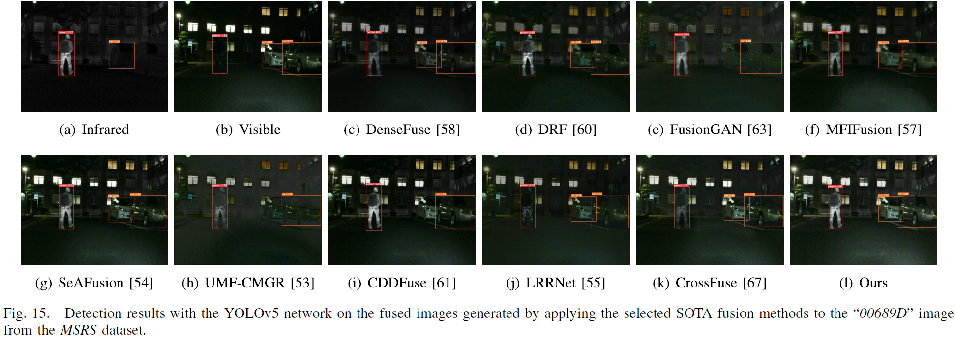 - 设置:采用改进 BisNet(IBisNet)预训练模型,在 MSRS(包含 ground-truth classification dataset)上对融合结果进行目标分割;分割可视化见 Fig. 12 与 Fig. 13。