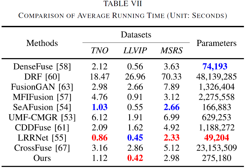 论文在三套数据上统计平均运行时间(秒)与参数量,并在 Table VII 中对比各方法效率: