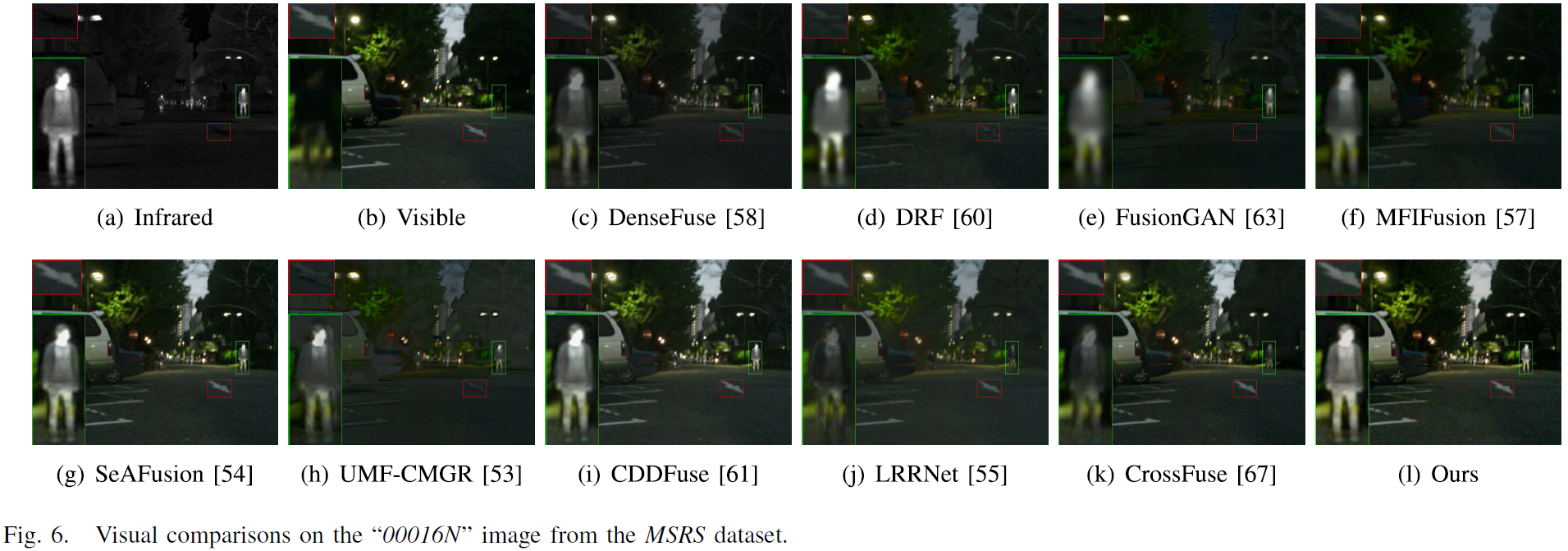 论文在 MSRS 的 “00016N” 与 “00024N” 两幅图像上展示对比结果,并逐一分析各方法在“保细节 vs 突目标”上的权衡: