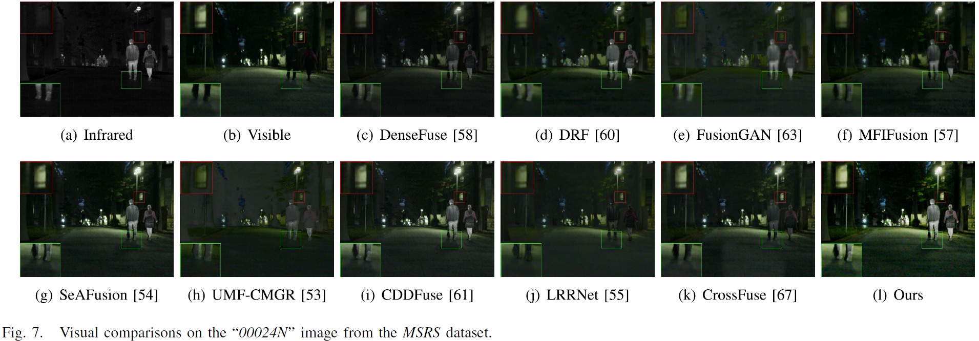 - LRRNet / CrossFuse:整体偏低对比度,低照区域细节难以分辨。
